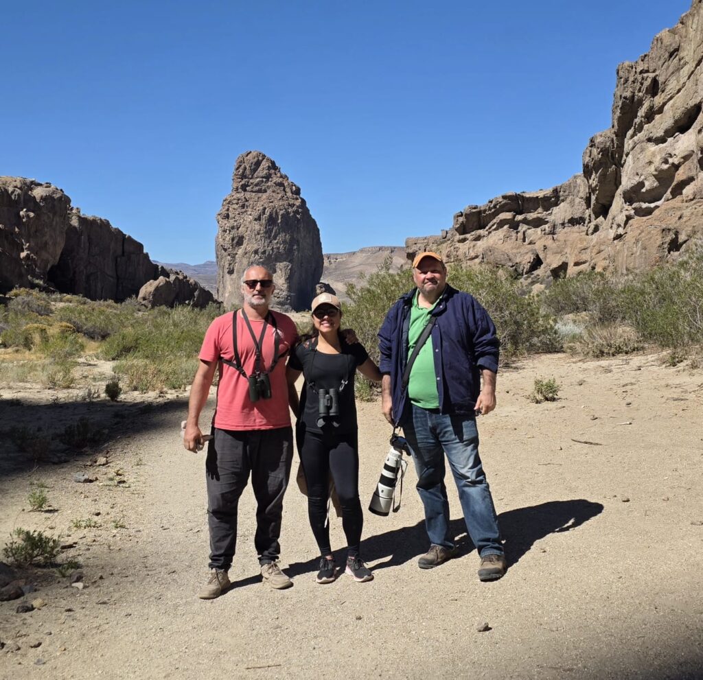 In the field with Bilal and Birding Puerto Madryn guides Agustín Esmoris and Agustina Ayala during the Monte and steppe segment in Chubut.